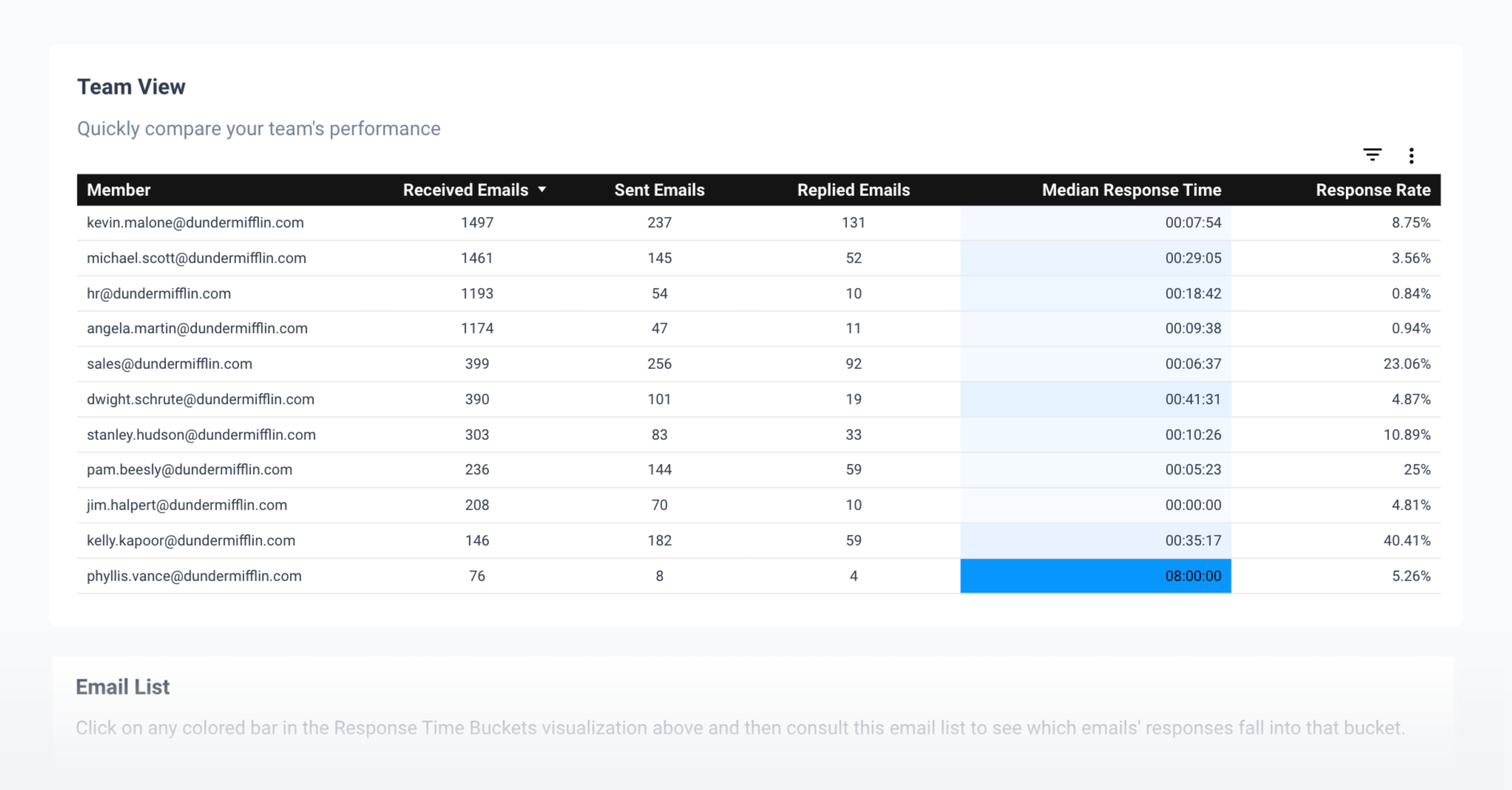 What percentage of received emails does each team member reply to? A low response rate is often the first visible signal of an overloaded inbox. Combined with volume data, it tells you whether someone is struggling to keep up or simply deprioritising certain types of emails.