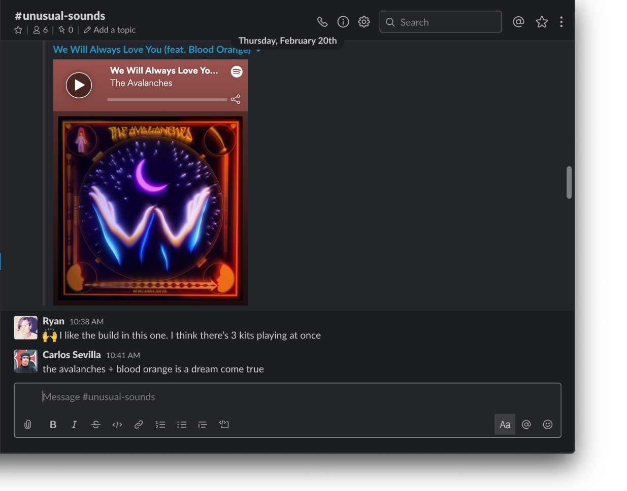 We still love chat! Like most companies, we use Slack as our real-time communication hub. It's a great tool to mimic the conversations you would have in an office environment. It can help people feel more connected to other parts of the company they might not normally talk to, even when they're together in an office. We have work related channels, but also affinity groups for music discovery, board games or fitness. We try to build a space to just hang out and talk about things unrelated to work, as you would do when you grab a coffee with a colleague.