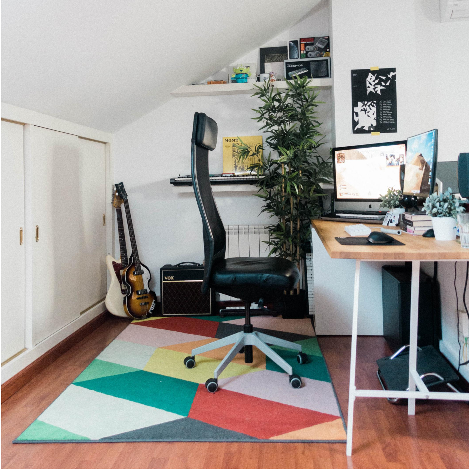 It's important to get a proper desk, an ergonomic chair and an external monitor (some of us even prefer two or three). We find the main benefit of having your own workspace is that you have complete control over how it looks, so you can make it as cool as you'd like. 😎